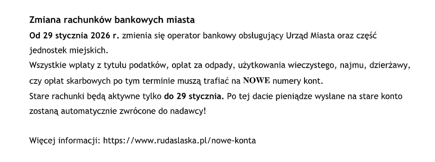 UWAGA!!! ZMIANA RACHUNKU BANKOWEGO SZANOWNI RODZICEOD DNIA 1.02.2026r.MIASTO RUDA ŚLĄSKA BĘDZIEOBSŁUGIWANE WYŁĄCZNIE PRZEZ BANK PEKAO […]