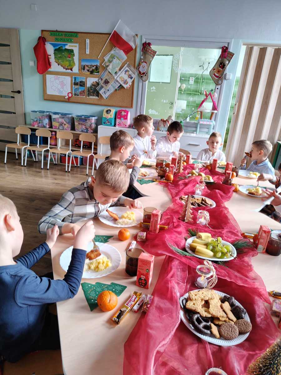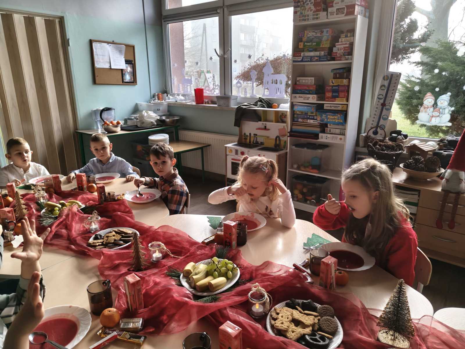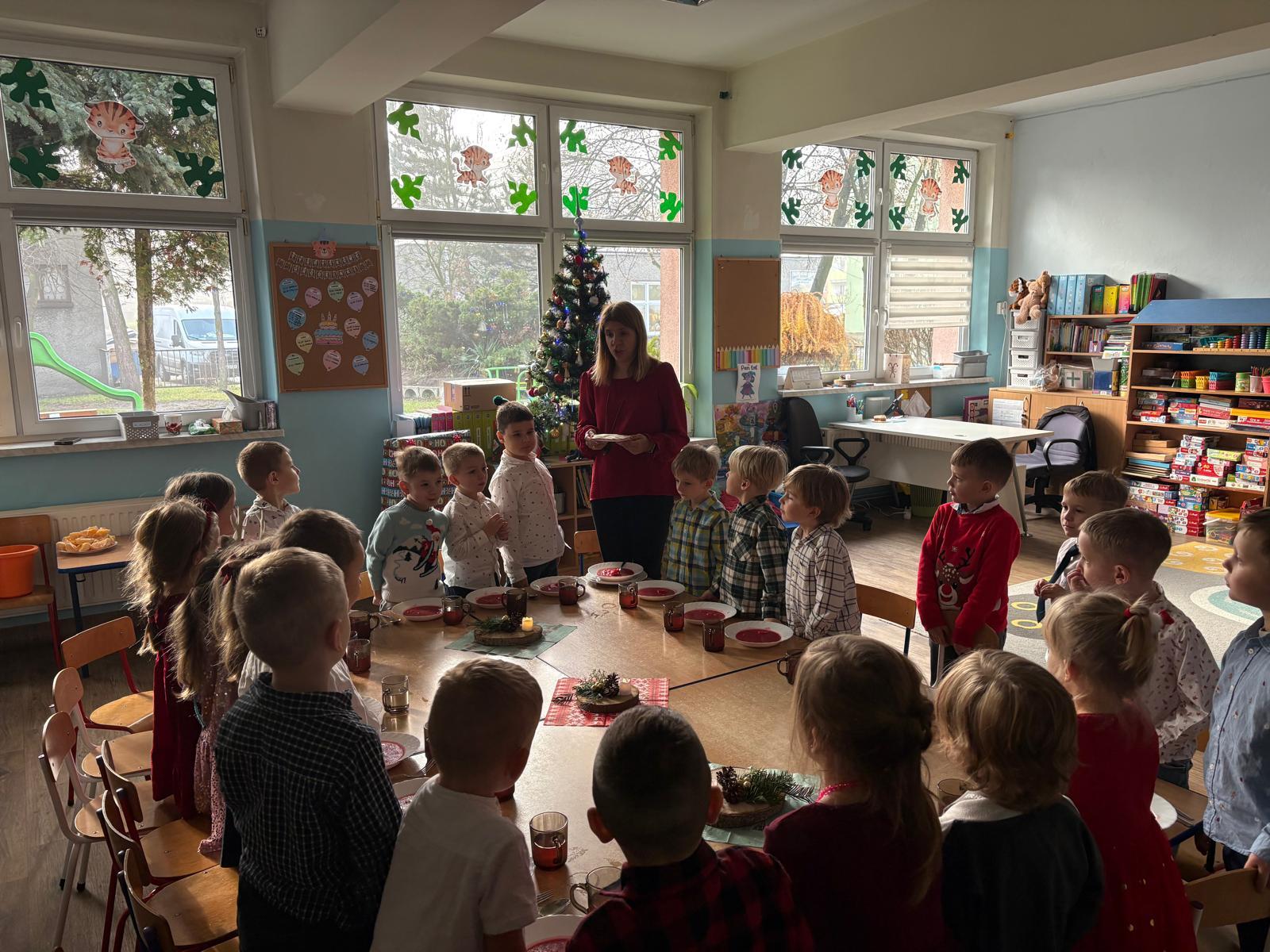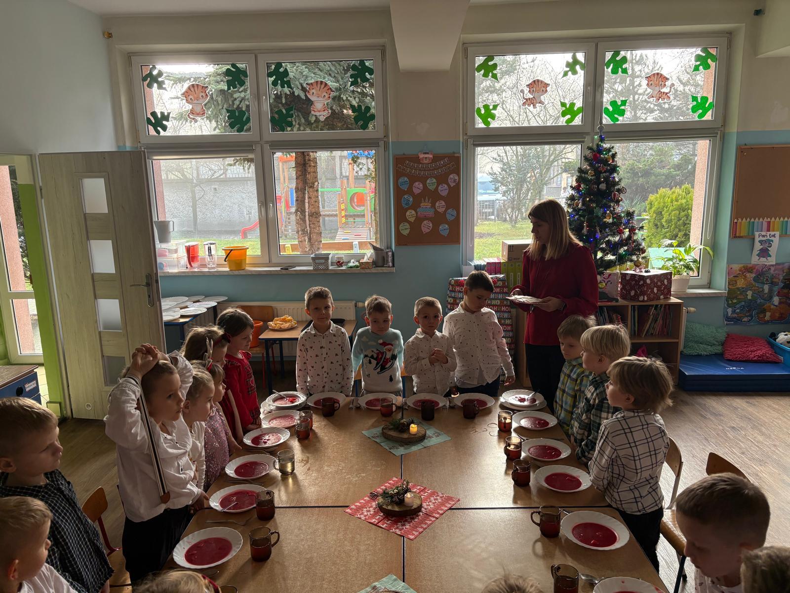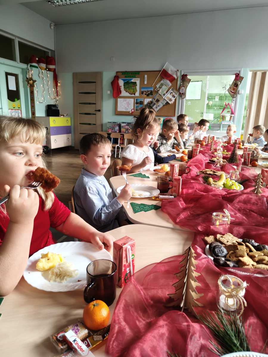W piątek w naszym przedszkolu w każdej grupie odbył się świąteczny obiad wigilijny. Wszyscy złożyli sobie uroczyste życzenia, podzielili się opłatkiem, zasiedli przy wspólnym stole i odpakowali grupowe prezenty. Wesołych zabaw nie było końca, a dźwięki kolęd przeniosły wszystkich w iście świąteczny nastrój.