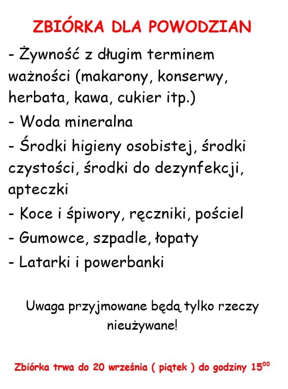 Serdecznie zapraszamy do udziału w zbiórce na rzecz powodzian. Wyszczególnione rzeczy można przekazywać Paniom w szatni – wszystko dostarczymy do najbliższego punktu zbiórki w naszym mieście tj. Śląskiego Inkubatora Przedsiębiorczości w Orzegowie.